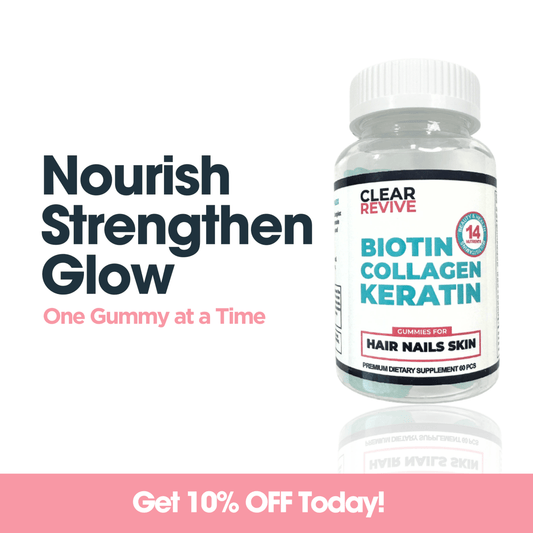 Glow from the inside out with Clear Revive Biotin, Collagen & Keratin Gummies—a delicious way to support your hair, skin, and nails. Packed with a powerful trio of beauty-boosting nutrients, these gummies are your go-to for achieving a radiant, healthy look.